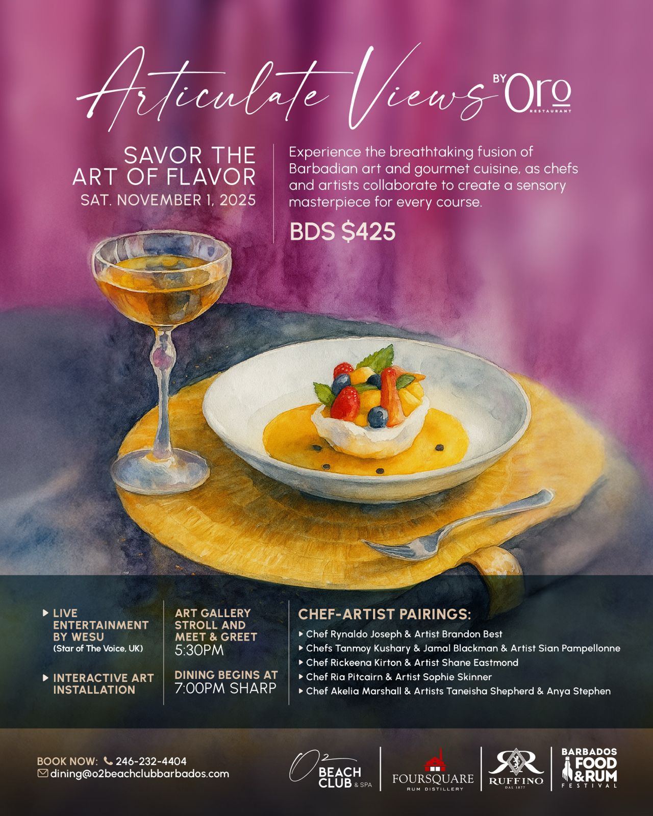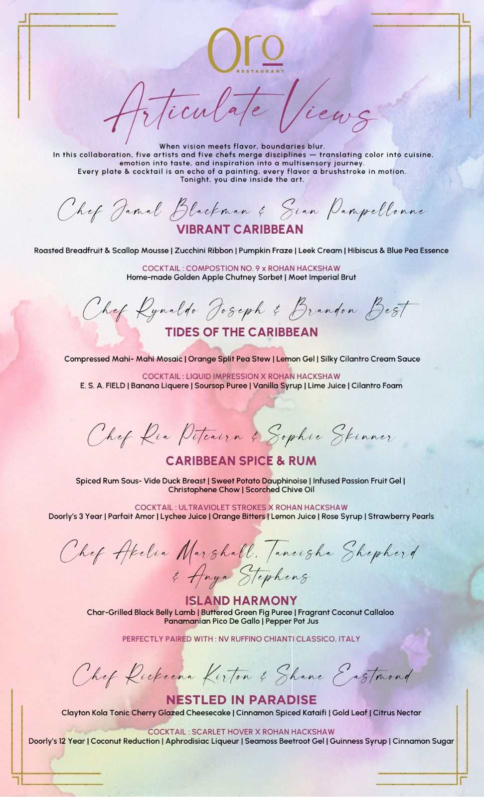 Step into the refined ambience of Oro Restaurant for an unforgettable evening that invites you to Savour the Art of Flavour, a feast for the senses featuring exquisite cuisine, fine wines, and the unmistakable spirit of the island, with each dish combining the artistry of the chef and one of our very own local artists to create their own masterpieces.